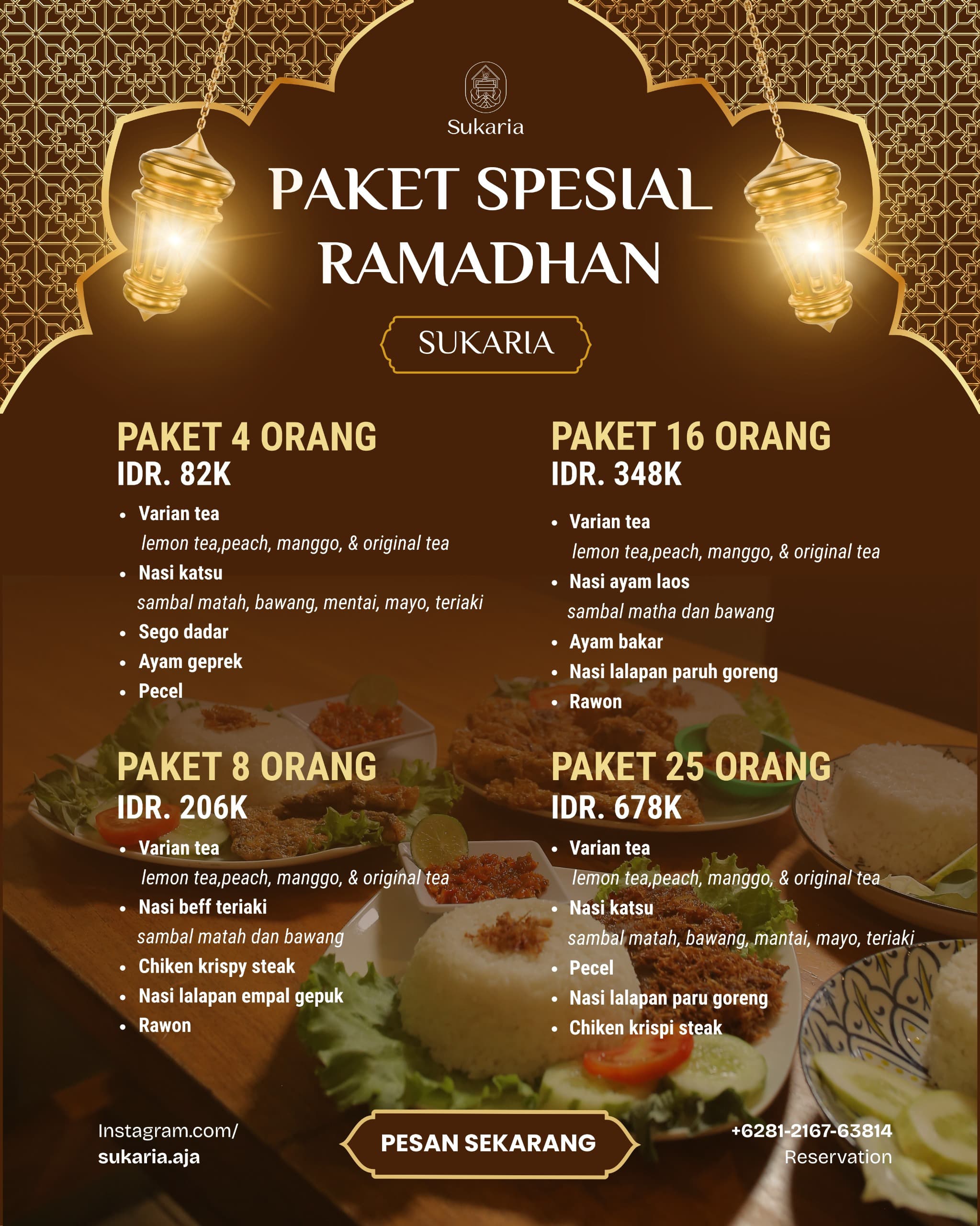 Mengusung tema “Bukber Ceria Penuh Rasa”, Sukaria Cafe dan Resto menawarkan paket berbuka dengan harga terjangkau per orang. Setiap paket sudah termasuk takjil pembuka, minuman segar, hidangan utama, serta aneka dessert yang menggugah selera. Menu yang disajikan pun beragam, mulai dari olahan ayam, seafood, hingga menu khas nusantara yang cocok dinikmati bersama keluarga maupun rekan kerja.